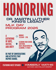 The East Cleburne Community Center invites you to their 2026 Martin Luther King Memorial Luncheon: Honoring the life and legacy of Dr. King. The event is slated for January 19, 2026, at Cleburne High School's Cafeteria. Keynote speaker for the event is Kinberly Mathis, author and philanthropist. The luncheon is free to the public.