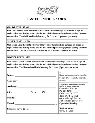 Operation Blessing of Johnson County will hold a Bass Fishing Tournament at McCown Valley at Lake Whitney on Saturday, April 20, 2019, with entry beginning at 6 a.m. and finishing up by 2 p.m. The entry fee of $150 covers a 2-man team with $25 of that fee going toward the Biggest Bass Contest. The Biggest Stringer Payout will be $2,000 with payment for 2nd and 3rd places as well. Rules and Regulations will apply with the Cleburne Bass Club weighing in and officiating. Lunch will be provided for this alcohol-free event. Sponsorship opportunities are available. Sponsorship and registration can be completed online at www.ob-jc.com. This fundraiser is working toward the puchase of a much-needed truck to pick up supplies.